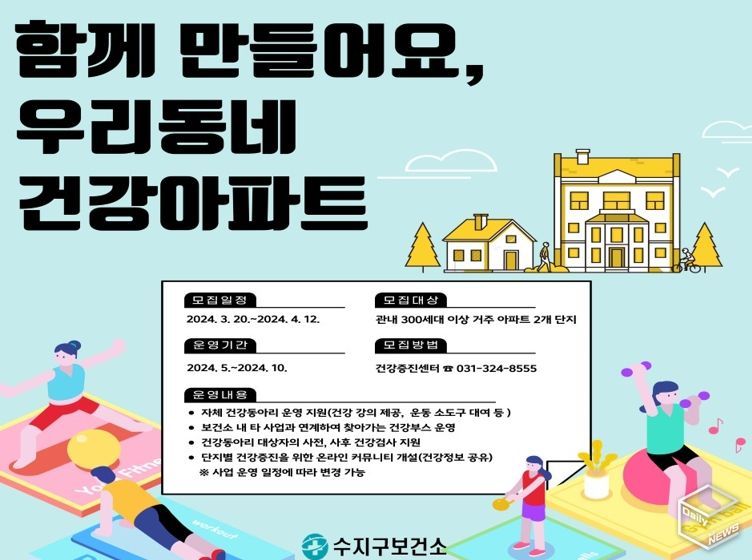 e데일리뉴스 | 용인특례시 수지구보건소는 다음 달 12일까지 ‘함께 만들어요, 우리동네 건강 아파트 사업’에 참여할 공동주택 단지를 모집한다고 24일 밝혔다.