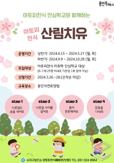 e데일리뉴스 | 용인특례시 수지구보건소 아토피‧천식 예방관리센터가 지역 내 아토피‧천식 안심학교를 대상으로 ‘아토피‧천식 산림치유’ 프로그램 참가자를 모집한다고 25일 밝혔다.