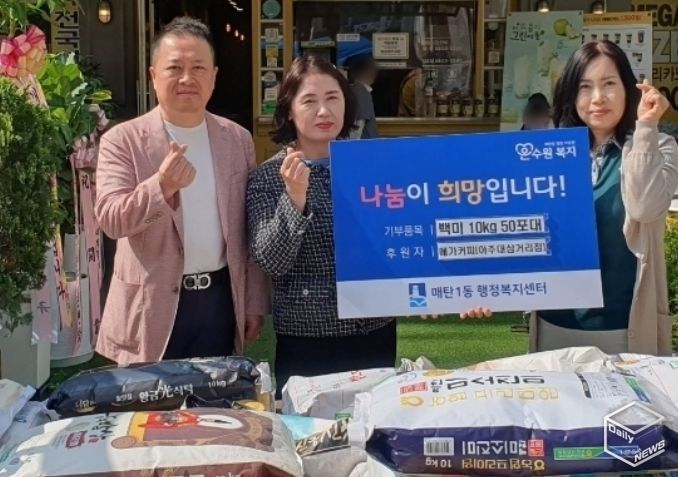e데일리뉴스 | 수원시 영통구 매탄1동 소재의 메가커피 아주대삼거리점은 19일 저소득 가정을 위해 백미10kg 50포를 후원했다.