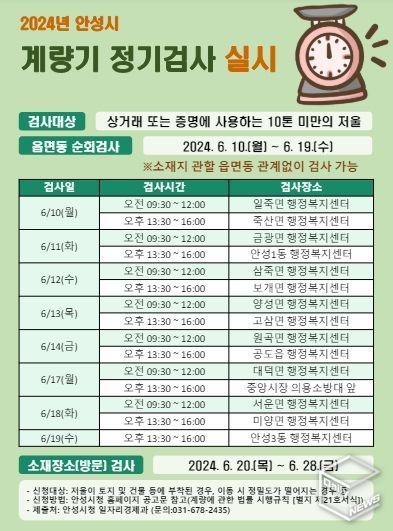 검사는 읍면동 순회검사와 소재장소 방문검사로 나눠 진행하며, 읍면동별 순회검사는 6월 10일부터 19일까지 각 행정복지센터 및 안성 중앙시장에서 검사 일정에 따라 실시되고, 소재장소 방문검사는 신청자에 한해 6월 20일부터 28일까지 진행할 예정이다.