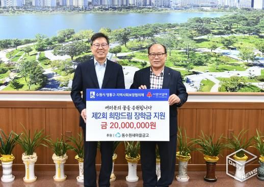 e데일리뉴스 | 수원시 영통구는 지난 12일 동수원새마을금고에서 관내 초‧중‧고등학생 56명을 위한“제2회 희망드림 장학금” 2,000만 원을 영통구에 기탁했다고 밝혔다.