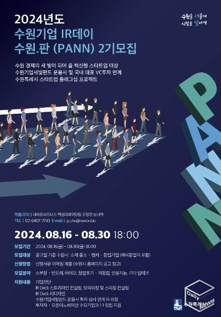 수원기업 IR2) 데이 수원.판(PANN)은 수원시가 마련한 스타트업 플래그십(전략 상품) 프로그램으로 수원시의 유망 중소·벤처·창업기업을 발굴해 IR 역량을 강화하고, 투자를 유치할 기회를 제공하는 것이다. 8월 30일까지 2기 참여기업을 모집한다.