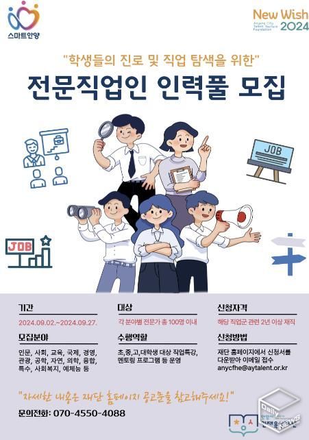 e데일리뉴스 | 안양시 인재육성재단은 9월 2일부터 27일까지 지역 학생들의 진로탐색을 지원하고, 다양한 직업 세계 경험 제공을 위한 전문직업인 인력풀을 모집한다고 4일 밝혔다.