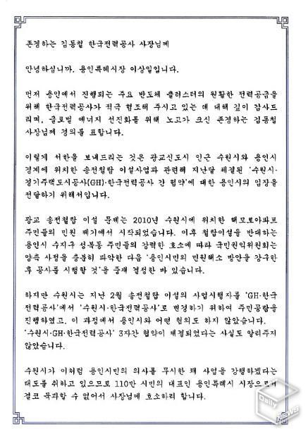 이 시장은 김 사장에 대한 서한에서 2010년 수원시 해모로아파트 주민들의 민원 제기에서 시작된 광교 송전철탑 이설 문제는 이설을 강력히 반대하는 용인시 수지구 성복동 주민들의 호소에 따라 국민권익위원회에서 양측 사정을 고려해 ‘용인 시민의 민원 해소 방안을 강구한 뒤 공사를 시행하라’고 중재한 사실을 강조했다.