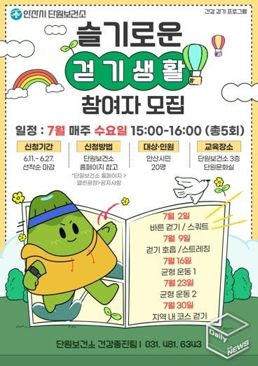 e데일리뉴스 | 안산시 단원보건소는 오는 27일까지 일상 속 건강 실천을 위한 걷기 프로그램 ‘슬기로운 걷기 생활’ 참여자를 모집한다고 14일 밝혔다.