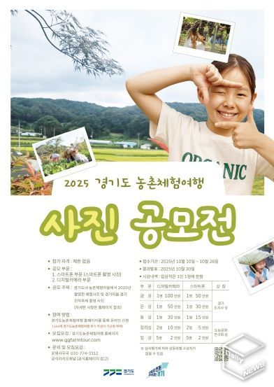 e데일리뉴스 | 경기도가 농촌 지역의 매력을 널리 알리고 체험관광을 활성화하기 위해 ‘2025 경기도 농촌체험여행 사진 공모전’을 개최한다. 공모전 접수는 10월 10일부터 26일까지며, 스마트폰과 디지털카메라 두 부문으로 진행된다.