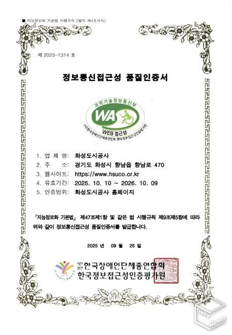e데일리뉴스 | 화성도시공사는 시각장애인, 고령자 등 정보 취약계층도 불편 없이 홈페이지를 이용할 수 있도록 지속적으로 개선해온 결과, 3년 연속 ‘웹 접근성 품질인증마크’를 획득했다고 10일 밝혔다.