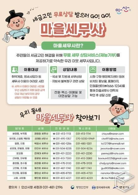 마을세무사 제도 이용을 원하는 시민은 안산시청 누리집이나 시청·구청·행정복지센터 등에 비치된 홍보물, 민원콜센터(166-1234) 등을 통해 거주 동을 담당하는 세무사 명단을 확인한 후 전화·방문·팩스 등으로 상담을 신청하면 된다.