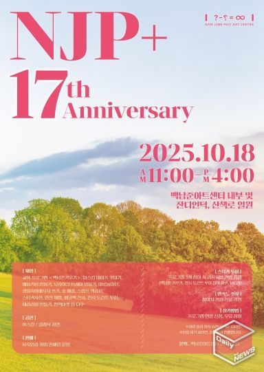 e데일리뉴스 | 경기문화재단 백남준아트센터(NJP, 관장 박남희)는 2025년 10월 18일, 개관 17주년 기념 축제 'NJP+'를 연다. 특히 이번 행사는 백남준아트센터와 경기도박물관, 경기도어린이박물관으로 이어지는 산책로 환경개선과 맞물려 축하의 의미를 더하고 있다. 아트센터는 올해 시민 예술 교육프로그램인 ‘퍼블릭 아카데미’ 운영, 지역 연계 협력 축제인 ‘제8회 머내마을영화제’ 공동체 상영관 참여, 유휴부지에 공유 정원을 조성하는 ‘이키로(2km) 정원행동 캠페인’ 등 지역과 환경을 잇는 새로운 고객서비스 프로그램을 기획·추진하고 있다.