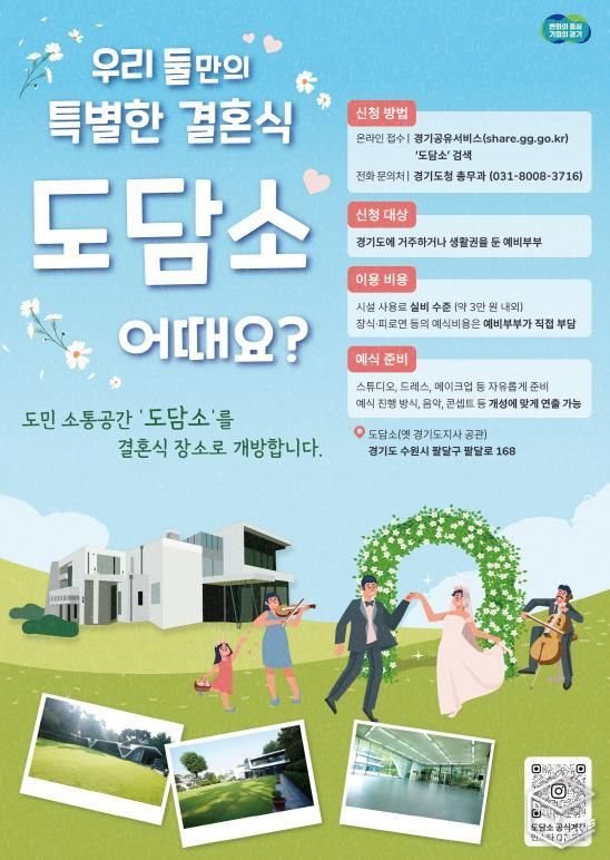 조병래 경기도 자치행정국장은 “많은 도민이 도심 속 정원에서 합리적인 비용으로 특별하고 의미 있는 결혼식을 올리길 바라는 마음으로 도담소 작은결혼식을 기획했다”면서 “형식보다 진심을 담는 결혼 문화의 새로운 변화를 이끌 수 있도록 작은결혼식의 정착을 지원하겠다”고 말했다.