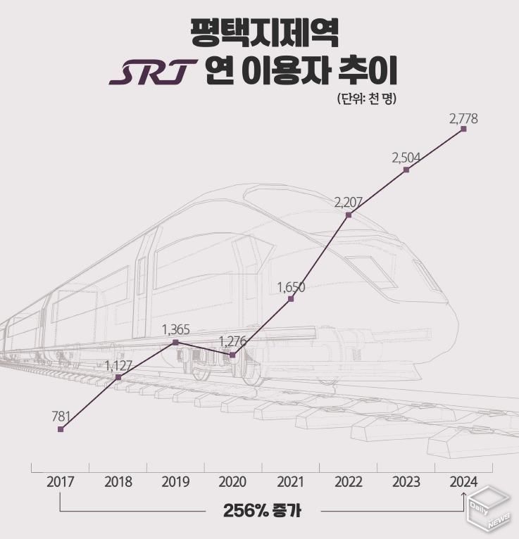평택지제역은 2016년 개통 당시부터 SRT가 정차한 역사로, 매년 이용객 수가 꾸준히 증가하고 있다. 실제 ‘철도연감’에 따르면 평택지제역의 연간 SRT 승하차 인원은 2017년 78만 1천 명이었지만, 2024년에는 277만 8천 명으로 256%의 증가율을 기록했다. 이러한 증가율은 SRT 역사 중 가장 높은 수치다.