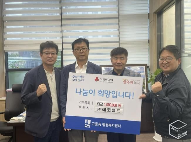 e데일리뉴스 | 수원시 팔달구 고등동은 10월 13일, 사회적기업 ㈜에코월드로부터 관내 취약계층을 위한 이웃돕기 성금 100만원을 전달받았다고 밝혔다.