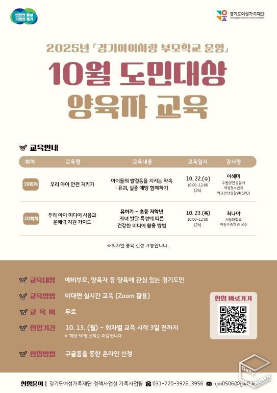 한편 이번 교육은 재단이 경기도 위탁으로 운영하는 ‘2025년 경기아이사랑부모학교’ 사업의 하나로 마련됐다. ‘경기아이사랑부모학교’는 경기도가 건강한 양육 문화 확산을 목표로 도민에게 체계적인 양육자 교육과 1:1 맞춤형 양육상담을 제공하는 사업이다.