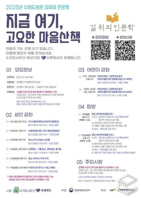e데일리뉴스 | 용인특례시 수지도서관은 오는 11월 1일부터 23일까지 ‘2025년 길 위의 인문학’ 프로그램 ‘지금 여기, 고요한 마음 산책’을 운영한다고 17일 밝혔다.