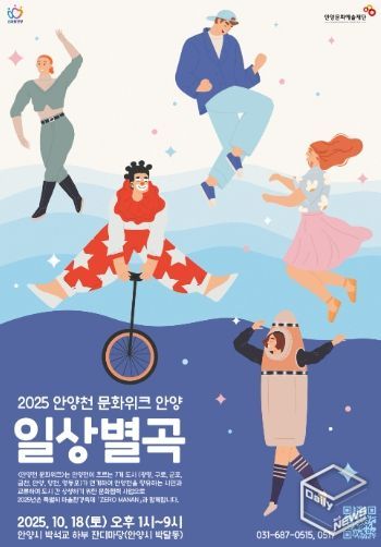 안양문화예술재단은 이번 문화위크 기간 중 10월 18일 오후 1시부터 5시까지, 박달동 박석교 하부 잔디마당에서 ‘2025 안양천 문화위크 안양 : 일상별곡’을 개최한다. 이번 행사는 만안종합사회복지관의 마을환경축제 ‘ZERO MANAN’과 공동 개최되며, 지역 내 환경문제에 심각성을 인식하고 공동대응하기 위한 친환경, 자원순환 부스가 운영된다. 부스 운영시간에는 가족 단위 방문객을 위한 상 ‘서커스 오브 안양천’ 공연과 서커스 체험 프로그램도 함께 진행된다.