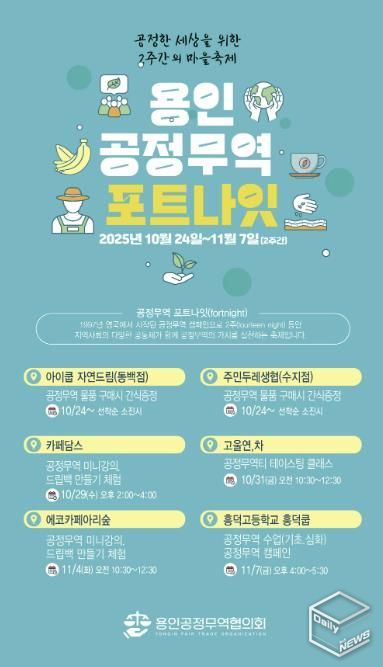 e데일리뉴스 | 용인특례시와 용인공정무역협의회는 10월 24일부터 11월 7일까지 2주간 용인시 공정무역 포트나잇 축제를 개최한다.