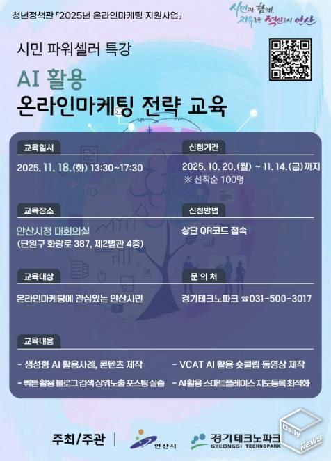 e데일리뉴스 | 안산시는 다음 달 14일까지 생성형 인공지능(AI)을 활용한 온라인 마케팅 역량 강화 ‘시민 파워셀러’ 6회차 교육생을 모집한다고 20일 밝혔다.