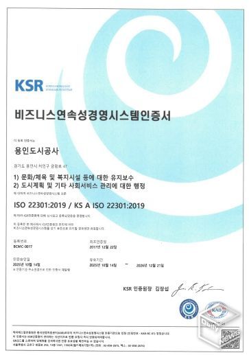 용인도시공사는 2018년 ISO22301(비즈니스연속성경영시스템)을, 2019년 ISO45001(안전보건경영시스템)을 각각 최초 취득한 이후, 매년 정기 사후심사 및 갱신심사를 통해 재난안전 분야의 국제표준을 꾸준히 유지하고 있으며, 시민의 생명과 안전을 지키기 위한 시스템 강화에 지속적으로 힘써왔다.
