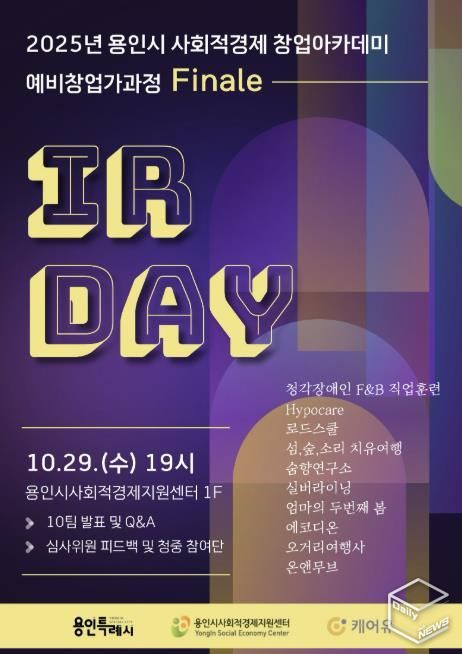 e데일리뉴스 | 용인특례시는 오는 29일 열리는 ‘사회적경제 창업아카데미 파이널 IR 데모데이’에 참가할 ‘청중평가단’을 모집한다고 22일 밝혔다.