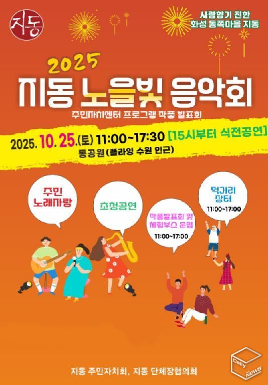 e데일리뉴스 | 오는 10월 25일, 수원시 팔달구 지동 동공원(지동 267-12)에서 활력 넘치는 가을날을 아름다운 음악과 주민들의 열정으로 채울 특별한 축제, ‘2025 지동 노을빛 음악회·주민자치센터 작품발표회’가 열린다.