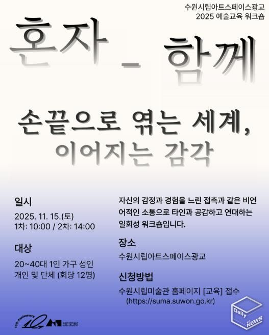 e데일리뉴스 | 경기도 수원시립미술관은 예술을 통해 타인과의 관계를 확장하고 감각을 회복하는 예술교육 워크숍 '혼자-함께'를 11월 15일 수원시립아트스페이스광교에서 개최한다.