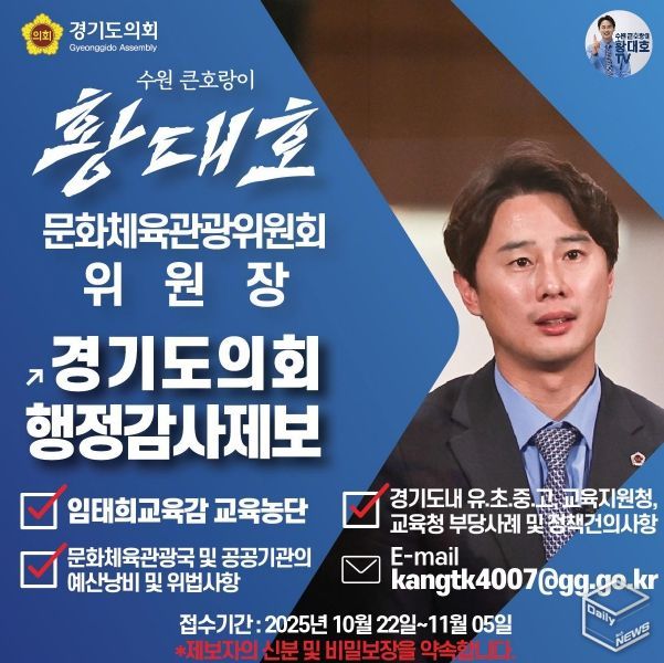 e데일리뉴스 | 경기도의회 문화체육관광위원회 황대호 위원장(더불어민주당, 수원3)이 2025년도 행정사무감사를 앞두고 도민들을 대상으로 공개제보를 받는다고 SNS 등을 통해 알렸다.