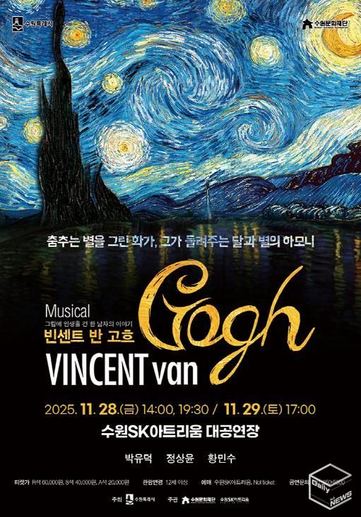 수원SK아트리움 대공연장 무대에서 만나 볼 '빈센트 반 고흐'는 지난 11년간 510회 이상의 공연으로 누적 관객 5만 명을 돌파한 K-뮤지컬 대표작 중 하나이다. 위대한 화가의 삶과 예술혼이 무대 위에 부활하는 특별한 경험을 만나 볼 수 있다. 오는 11월 28일 금요일과 29일 토요일 양일간 3회 공연이 진행된다.
