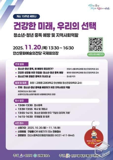 e데일리뉴스 | 안산시 중독관리통합지원센터는 오는 20일 안산문화예술의전당 국제회의장에서 개소 15주년을 맞아 ‘건강한 미래, 우리의 선택: 청소년·청년 중독 예방 및 지역사회역할’을 주제로 기념 세미나를 개최한다고 4일 밝혔다.