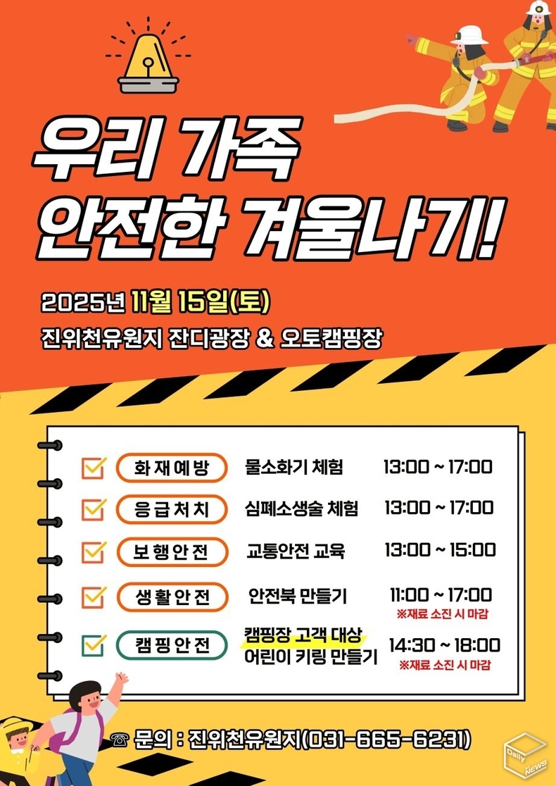평택도시공사 관계자는 “진위천유원지를 찾는 시민들이 가족과 함께 즐겁게 체험에 참여하며 겨울철 화재‧캠핑 안전수칙을 자연스럽게 익히고, 안전한 생활문화를 확산하는 데 도움이 되기를 기대한다”라고 말했다.