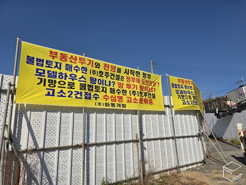 ㈜화동개발은 이미 H건설 실질 소유주 A모 이사와 그의 아들을 상대로 허위 시행권 주장, 토지 매집, 허위 민원 제출, 행정절차 개입,야간 현수막 철거 및 무단침입 등의 혐의로 고소한 상태다. 최근에는 현수막이 야간에 철거됐다는 의혹까지 제기되면서 집회방해·재물손괴 등 고소 건수도 추가됐다.