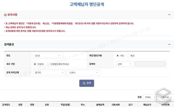 고액·상습체납자 명단은 수원시 홈페이지'분야별정보'세금'정보마당'‘고액 상습체납자 공개’ 게시판에서 확인할 수 있다.