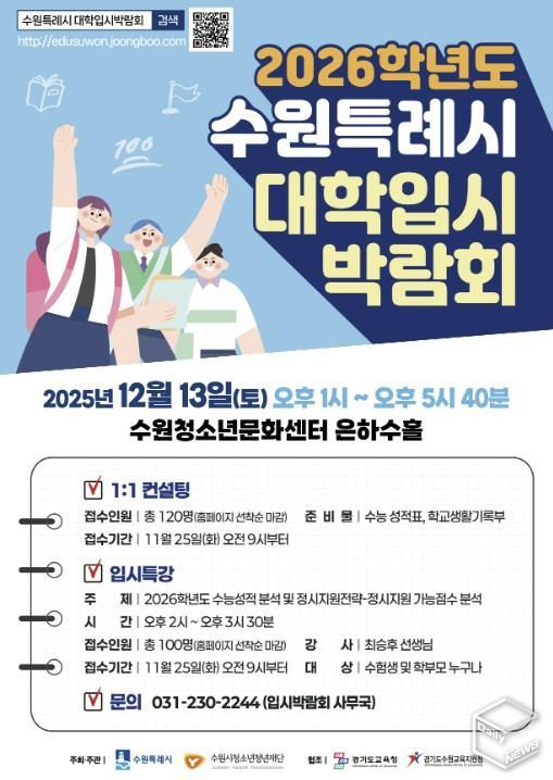 e데일리뉴스 | 수원시청소년청년재단청소년희망등대는 2026학년도 대입을 준비하는 수험생과 학부모를 위해 오는 12월 13일 수원청소년문화센터에서 ‘수원특례시 2026학년도 대학입시박람회’를 개최한다. 박람회는 이날 오후 1시부터 5시 40분까지 진행된다.