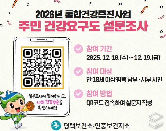 e데일리뉴스 | 평택시 평택보건소는 10일부터 오는 19일까지 지역사회 주민 500명을 대상으로 2026년 통합건강증진사업 계획 수립을 위한 ‘주민 건강요구도 조사’를 시행 중이라고 밝혔다.