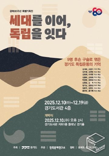 e데일리뉴스 | 경기도가 광복 80주년을 맞아 10일부터 19일까지 경기도서관 4층에서 독립운동가와 그 후손들의 삶을 통해 독립정신을 되새기는 사료전시회 ‘세대를 이어, 독립을 잇다’를 연다.