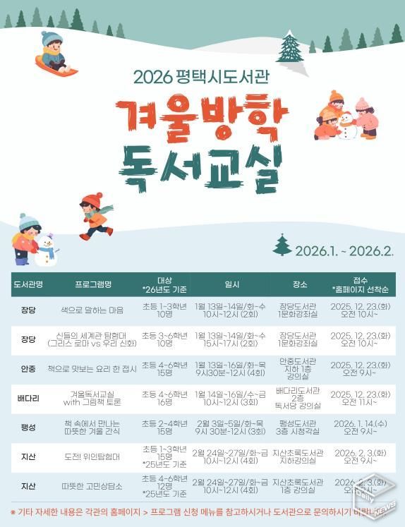 e데일리뉴스 | 평택시 도서관은 겨울방학을 맞아 어린이들의 사고력과 창의력 향상을 돕기 위해 녪겨울방학 독서교실’을 오는 1~2월까지 관내 5개 도서관에서 운영한다고 밝혔다.