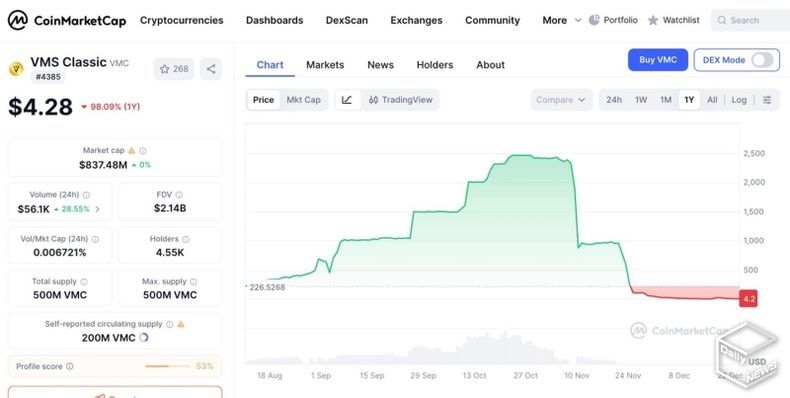 출금정지처분의 결정적 요인은 자체 발행한 VMC 코인이 불법매도된 사건이다. 2025년7월에 최초 미국 거래소인 Bitmart 에 상장한 VMC 는 상장가 $10을 시작으로 높은 상장 시작가임에도 불구하고 2개월만에 $600 대를 돌파했다. 사건이 터지기 11월4일 전까지는 $2,400 까지 넘어서는 놀라운 기록을 보였지만 결국 불법매도가 시작된 LBank 가 빅토리아 거래소를 금융당국에 신고하면서 현재는 상장가 미만으로 가격이 폭락하게 되는 희대의 사건으로 전락하고 말았다.