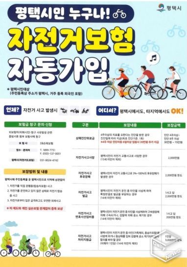 e데일리뉴스 | 평택시가 시민의 안전한 자전거 이용을 위해 전 평택시민을 대상으로 하는 자전거 보험을 2026년에도 갱신 가입하고, 각종 자전거 사고에 대비한 보장을 지속 제공한다고 밝혔다.