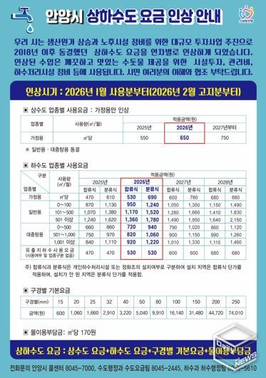 e데일리뉴스 | 안양시는 상하수도 생산원가 상승과 노후 시설 정비를 위한 대규모 투자 재원 확보를 위해 2026년 1월 사용분(2월 고지분)부터 상하수도 요금을 인상한다고 11일 밝혔다. 이번 인상은 고물가 상황 속에서 시민들의 경제적 부담을 최소화하기 위한 ‘단계적 현실화 계획’에 따른 것이다.