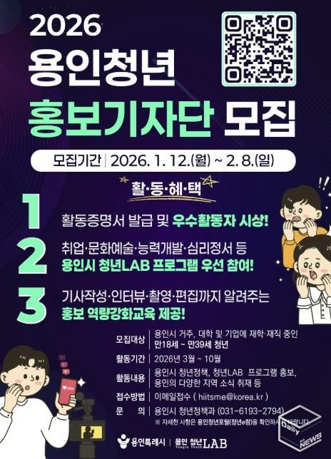 이상일 시장은 “청년들의 시각과 언어로 시정과 지역 이야기를 전해 시민 공감대를 높이고 동시에 청년들에게는 홍보·미디어 분야의 실질적인 경험을 제공하고자 한다”며 “관심 있는 청년들의 적극적인 참여를 바란다”고 했다.