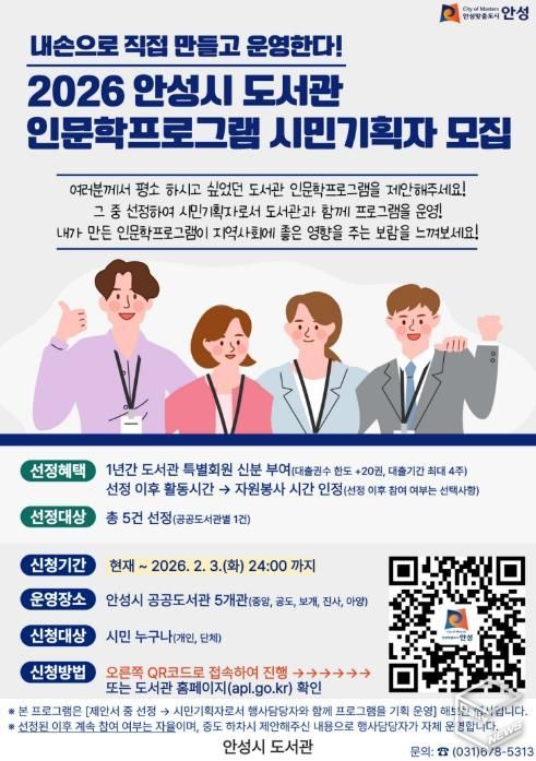 e데일리뉴스 | 안성시는 ‘2026년 안성시 도서관 시민 공동기획 인문학프로그램’을 추진하며, 인문학 프로그램을 직접 기획하고 운영할 시민기획자를 오는 2월 3일까지 모집한다고 밝혔다.