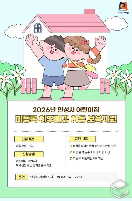 e데일리뉴스 | 안성시는 2026년부터 어린이집에 다니는 미등록 외국인(이주배경) 영유아에게 월 10만원의 보육지원금을 지원한다고 밝혔다.
