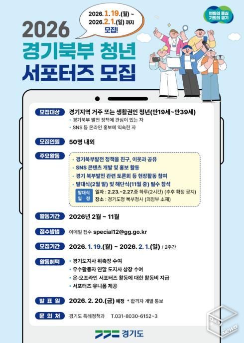 모집 규모는 50명 내외이며, 경기북부 발전에 대한 관심과 누리소통망(SNS) 및 인터넷카페, 블로그 등 활용이 가능한 경기지역 거주 또는 생활권인 청년이면 누구나 신청할 수 있다. 모집기간은 1월 19일부터 2월 1일까지며, 경기도 누리집에 게시된 서식을 내려받아 작성 후 이메일 신청하면 된다.