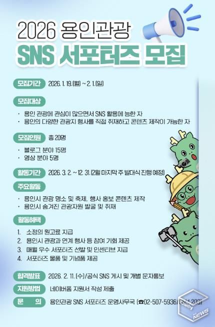 e데일리뉴스 | 용인특례시는 2월 1일까지 용인의 관광자원과 다채로운 축제·행사를 시민의 시각에서 생동감 있게 홍보할 ‘용인관광 SNS 서포터즈’를 모집한다고 20일 밝혔다.