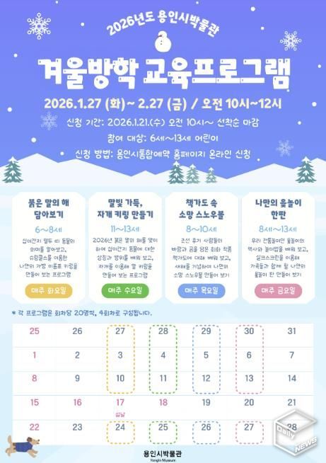 e데일리뉴스 | 용인시박물관은 어린이들이 역사와 전통문화를 쉽고 재미있게 체험할 수 있는 ‘2026년 겨울방학 교육 프로그램’을 운영한다고 20일 밝혔다.