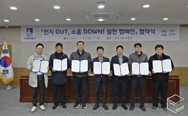 수원시 권선구는 지난 1월 27일 구청 상황실에서 관내 대형공사장 6개소와 비산먼지 및 소음 저감을 위한 ‘먼지 OUT, 소음 DOWN! 실천 캠페인’ 자율 실천 협약식을 개최했다.