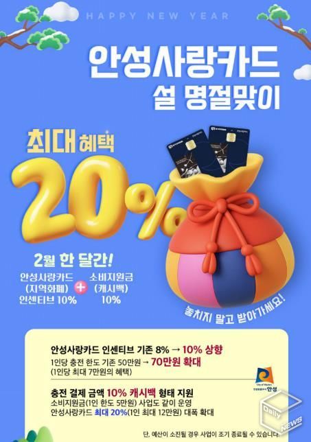 e데일리뉴스 | 안성시가 설 명절을 맞아 시민들의 장바구니 부담을 덜어주고, 위축된 골목상권에 활력을 불어넣기 위해 2월 한 달간 안성사랑카드 혜택을 최대 20%로 상향한다.