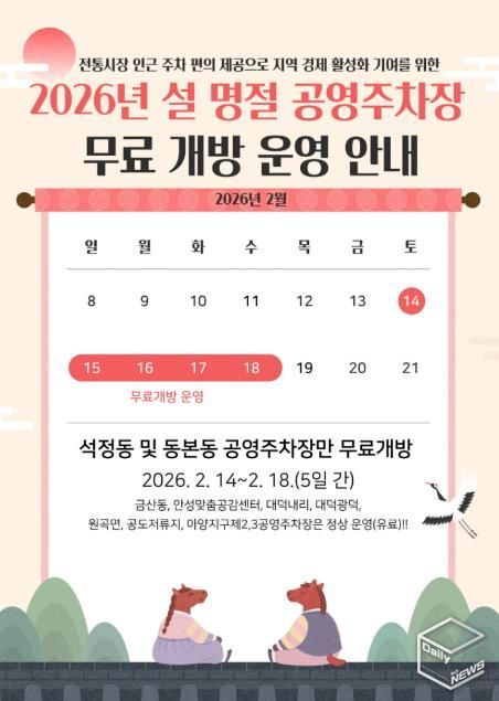 e데일리뉴스 | 안성시시설관리공단은 2026년 설 명절을 맞아 2월 14일부터 18일까지 5일간, 공단이 관리하는 공영주차장 중 전통시장 인근에 위치한 석정동 공영주차장과 동본동 공영주차장을 한시적으로 무료 개방한다고 밝혔다.