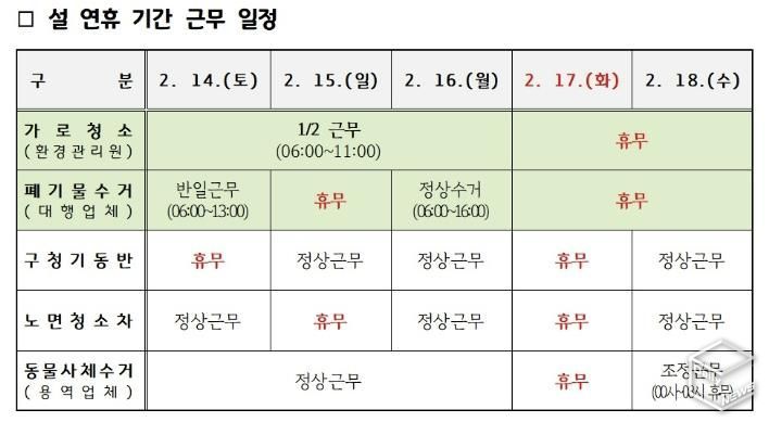 장안구 관계자는 “설 연휴 기간에도 청소 공백이 발생하지 않도록 철저히 대비하고 있다”며 “구민 여러분께서도 쓰레기 배출일과 배출 방법을 준수해 쾌적하고 즐거운 명절을 함께 만들어 주시길 바란다”고 말했다.