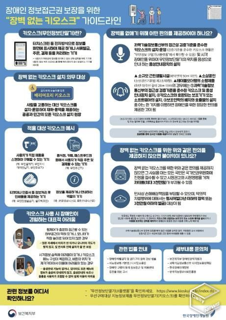 최근 개정된 ‘장애인차별금지 및 권리구제 등에 관한 법률’ 시행령에 따라, 공공과 민간에서 키오스크(무인정보단말기)를 설치·운영하는 경우 접근성 검증 기준을 충족하는 기기를 사용하고, 시각장애인을 위한 음성 안내 장치를 갖춰야 한다.