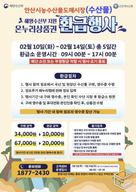e데일리뉴스 | 안산시는 설 명절을 맞아 국산 수산물 소비 촉진과 도매시장 활성화를 위해 오는 10일부터 14일까지 5일간 ‘2026년 설 온누리상품권 환급행사’를 개최한다고 5일 밝혔다.